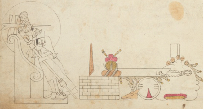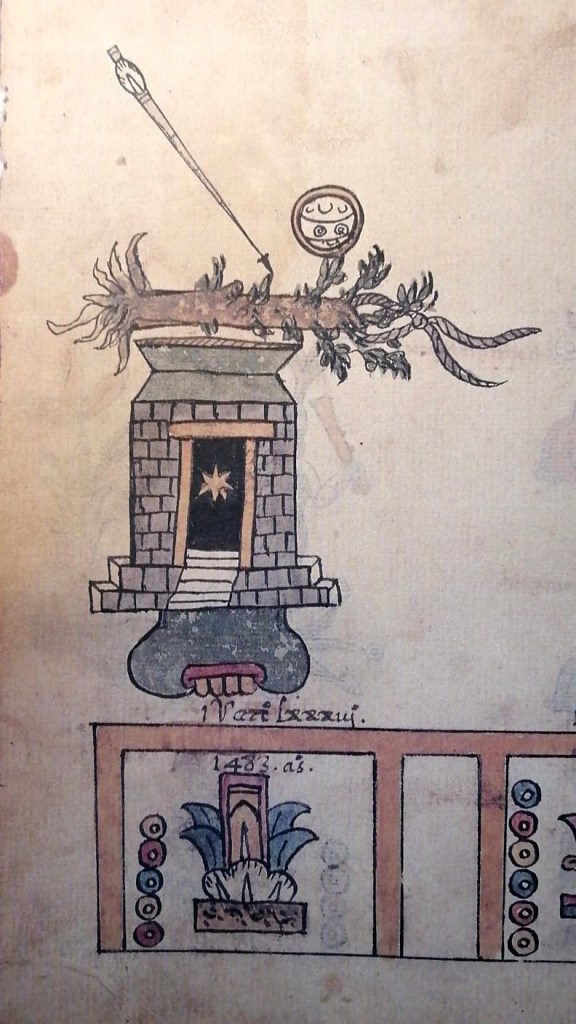 I want to thank Stan Declercq for facilitating me the relevant pages of Graulich’s edition of the Codex Azcatitlan. As in many other entries, I also want to thank Gabriel Kruell for reading this text and offering his views on it. He offers the following reading for the Azcatitlan: “Tizocicatzin was installed on the throne. In this year, he laid tezontle on the Temple of Huitzilopochtli. The inhabitants of Chiapan rebelled, wooden beams were brought from Itzmiquilpan, ahuehuete logs were dragged to serve as beams in the temple of Huitzilopochtli, but they didn’t want to work, they burned the ropes, and they mutinied”