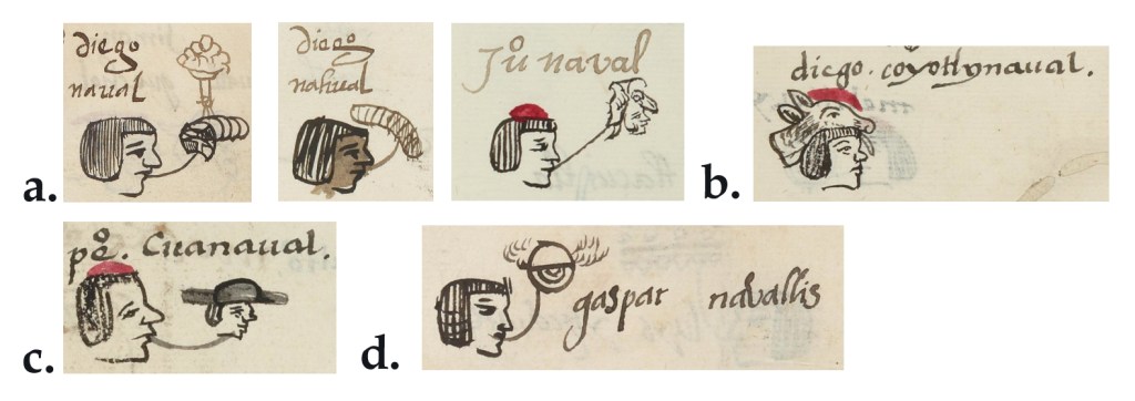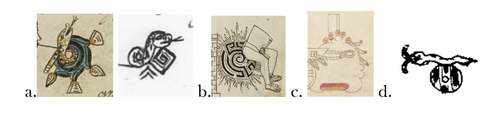 Figure 3. a) CHIYAUH-COA, Chiyauhcoa(tl) (Matrícula de Huexotzinco 711r, 816r); b) CHIYAUH-tzin, Chiyauhtzin(co) (Matrícula de Huexotzinco 601r; cfr. Thouvenot 2012); c) CHIYAUH-pa, Chiyauhpan, Chiyauhpan (Azcatitlan 19v); d) CHIYAUH,Chiyauh(pan), Chiyauhpan. (Codex en Cruz 7).