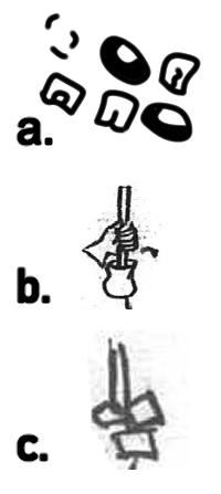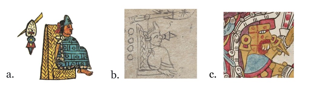 Figure 3. a) tiz-zo-zo, Tizo(c), Tizoc (Florentine Codex 2, 2r), b) TECU-zo-ILHUICA-MINA, (Mo)tecuzo(ma) Ilhuicamina, ‘He is angry like a lord, he shoots the heavens’; notice that the royal diadem of the tlatoani is part of the reading (Codex Mexicanus 64); c) Chantico’s earplugs (Codex Telleriano Remensis 41v).