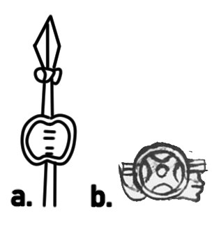 OQUICH: Interpreted by Diel as referring to the human nature of Christ by alluding to his death (169), a variant of this logogram for oquichtli, ‘man’ is attested in Codex Huexotzinco 689r, where the shield is a native chimalli and some darts (b) rather than a Spanish adarga and lance (cfr. Thouvenot 2012). Hence, the shield and spear denote manliness, which belongs to the actual semantics of the word, which “when combined can refer to masculinity, manliness, courage, bravery; might also refer to the son of God (see Molina and attestations)” (Wood 2020).
