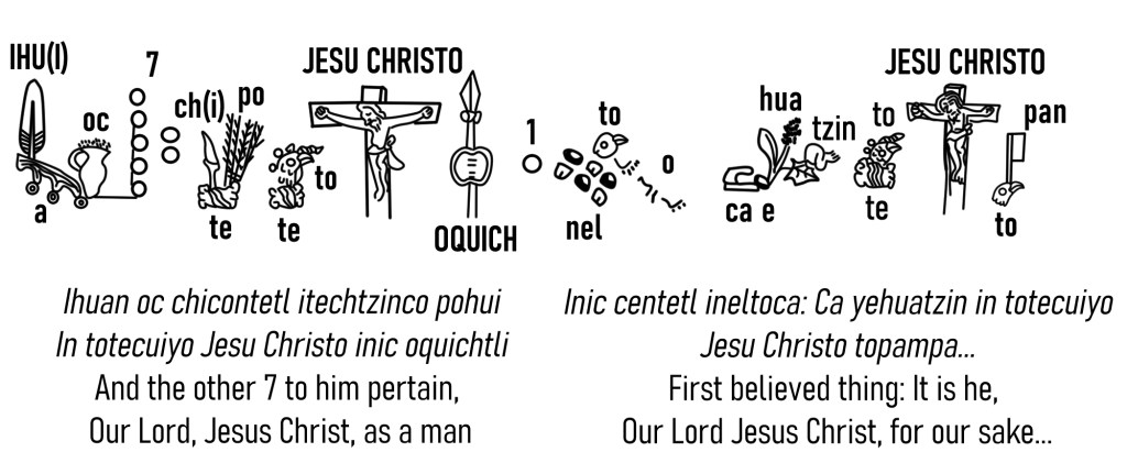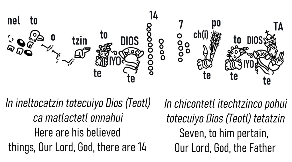 Figure 2. Part 1 of the Articles of Faith, Codex Mexicanus 52-53. nel-to-o-tzin-to-te-IYO-DIOS-te-14-7-te-ch(i)-po-to-te-IYO-DIOS-te-TA, (In i)nelto(ca)tzin tote(cu)iyo Dios Te(otl, ca) matlactetl onnahui. (In) chicontetl (i)tech(tzinco) po(hui) tote(cu)iyo Dios Te(otl te)ta(tzin), “Here are his believed things, Our Lord, God, There are 14. Seven to him pertain, Our Lord, God, the Father.”Figure 3. Part 2 of the Articles of Faith, Codex Mexicanus 53-54. IHU(I)-a-oc-7-te-chi-po-to-te-JESU-CRISTO–OQUICH-1-nel-to-o-ca-e-hua-tzi-to-te-JESU-CRISTO-to-pa, Ihua(n) oc chicon(tetl i)tech(tzinco) po(hui in) tote(cuiyo) Jesu Christo(inic) oquich(tli.Inic) cen(tetl i)nelto(ca) ca (y)ehuatzin (in) tote(cuiyo) Jesu Christo. Topam(pa)…, ‘And the other seven to Him pertain, Our Lord, Jesus Christ, as a man. First Believed thing: It is he, Our Lord Jesus Christ, for our sake…
