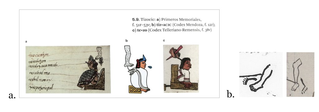 As mentioned, the name Tizoc is an etymological enigma. No real consensus on its origin exists, given the fact that the name as such is nonsensical in Nahuatl (Whittaker 2021: 149); the most accepted, but still doubted, proposal is that of Cecilio Robelo (1909: 356-360) who proposes that the speculative etymology offered by Torquemada and Clavijero, ‘the pierced one’, makes no grammatical sense, and offers ‘the bled one’ in substitution, discarding also the form tezoc, ‘bleeder’. Robelo’s disquisition is interesting, because it is not only etymological, but also epigraphic, and as such it reflects the prejudices of the time on Aztec writing. He suggests that the usual form of this emperor’s name, a leg with little dots, is not phonetic but ‘ideographic’ (mostly a synonym for ‘logographic’ in his terminology), and is a reference to the act of self-bleeding, an interesting problem in itself to which I will return later.