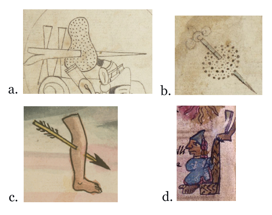 The two variants found in Codex Duran are perhaps the most problematic (Figure 6). The first variant presents a darkened leg being pierced. Usually, this is the logogram TLIL, ‘dark’, but in this case, this logogram is read it seems, quite exceptionally, as a syllabogram ti. Indeed, this form may be related to the equally rare spelling of the name Tlalticpac, (‘On the Earth’) found in Codex Vergara 20r. Note that the ‘ink’ element (tlilli, logogram TLIL) above the logogram TLAL, tlalli, ‘earth’, an arrangement which is read (T)ICPAC, as Whittaker has shown in his analysis of the glyphs for Oztoticpac in Codex Mendoza 10v (2021: 108), and the pa syllabogram derived from the logogram PAPA, from papatli, ‘hair’. An alternative explanation of this hapax form is a scribal error in the rendering of the striped pattern tiz. The next one is equally perplexing, and is another hapax. It presents a leg with some bells (coyolli) being pierced. The second element could be the logogram COYOL, coyolli, bell, although the most likely explanation is that in this case the sign is iconographic and does not have any reading. If this element were not to be ignored, my best guess here is that some metathesis is present, transforming the first syllable co- into oc (as OL becomes lo in the Spanish name “Alonso”, cfr. Davletshin 2021: 63) but of course this is uncertain for the moment, as no other examples of this reading for the glyph could be found in the corpus. I advance the two explanations for these strange forms, but the reader can decide for the more conventional solutions.