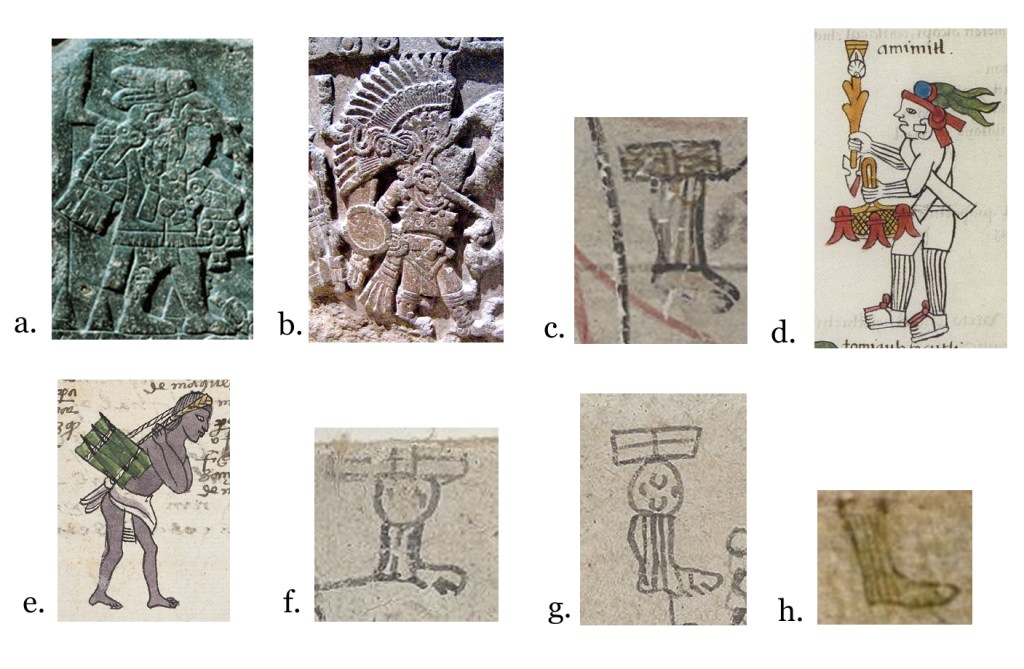 An interesting problem arises with the most well-known form, which we could nickname ‘dotted leg’. We have seen that both Robelo and Whittaker have opposing views, the first stating that the dots are piercing signs, and the other stating that the dots are chalk. In fact, strictly speaking, both can be true. The ‘chalk’ (tizatl) element can be both denoted by a ball of chalk or by a dotted pattern, as numerous examples in Codex Mendoza (cfr. Wood 2020) makes clear. However, less known but visually identic is a variant of zo found in the profession caczoc, ‘sandal maker’ in the Matricula de Huexotzinco, which shows a sandal (cactli) or a corn husk (zoctli) marked with small piercings all over, already classified by Marc Thouvenot (2019b). I have followed Whittaker in reading tiz-xo, but the reading zo-xo is probable too (Figure 4).
